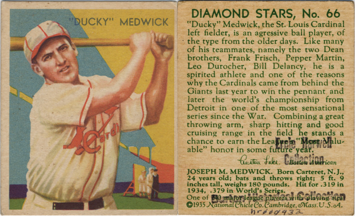 Portrait of Joe Medwick, left fielder for the St. Louis Cardinals. Diamond Stars series. Printed on front: "'Ducky' Medwick." Printed on back: "Diamond Stars, no. 66. 'Ducky' Medwick, the St. Louis Cardinal left fielder, is an agressive [sic] ball player, of the type from the older days. Like many of his teammates, namely the two Dean brothers, Frank Frisch, Pepper Martin, Leo Durocher, Bill Delancy, he is a spirited athlete and one of the reasons why the Cardinals came from behind the Giants last year to win the pennant and later the world's championship from Detroit in one of the most sensational series since the War. Combining a great throwing arm, shart hitting and good cruising range in the field he stands a chance to earn the League's 'Most Valuable' honor in some future year. Austen Lake, Boston American. Joseph M. Medwick. Born Carteret, N.J., 24 years old; bats and throws right; 5 ft. 9 inches tall, weighs 180 pounds. Hit for .319 in 1934, .379 in World's Series. One of 240 major league players with playing tips. [Copyright] 1935, National Chicle Co., Cambridge, Mass., U.S.A."