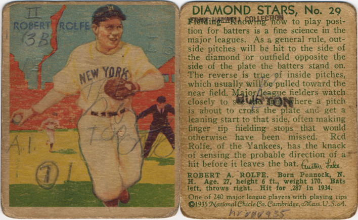Portrait of Red Rolfe, third baseman for the New York Yankees. Diamond Stars series. Printed on front: "Robert Rolfe." Handwritten on front: "II. 3B. 1B. IB. A.I. 7 [in circle]." [additional writing not legible]. Printed on back: "Diamond Stars, no. 29. Fielding - Knowing how to play position for batters is a fine science in the major leagues. As a general rule, outside pitches will be hit to the side of the diamond or outfield opposite the side of the plate the batters stand on. The reverse is true of inside pitches, which usually will be pulled toward the near field. Major league fielders watch closely to see the spot where a pitch is about to cross the plate and get a leaning start to that side, often making finger tip fielding stops that would otherwise have been missed. Red Rolfe, of the Yankees, has the knack of sensing the probable direction of a hit before it leaves the bat. Austen Lake. Robert A. Rolfe. Born Pennock, N.H. Age. 27, height 6 ft., weight 170. Bats left, throws right. Hit for .287 in 1934. One of 240 major league players with playing tips. [Copyright] 1935, National Chicle Co., Cambridge, Mass., U.S.A."