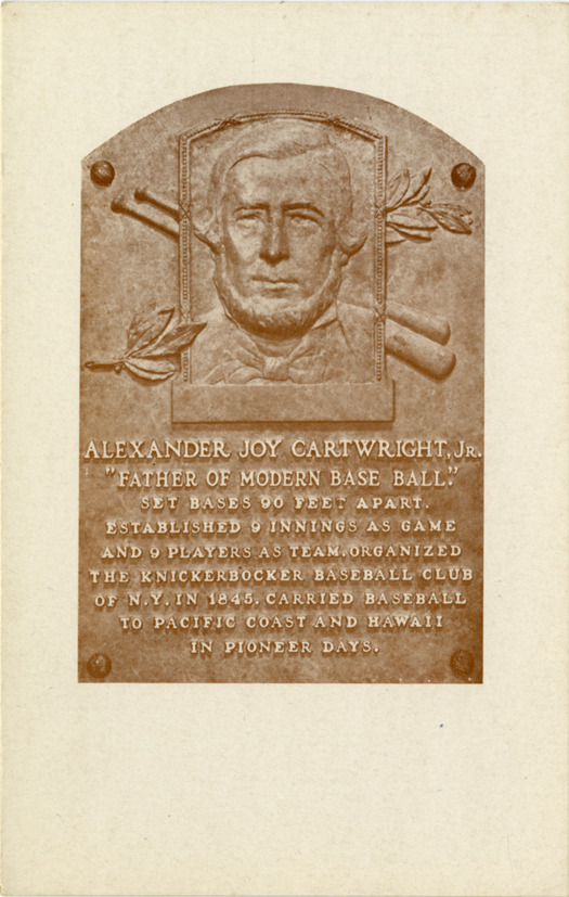 View of bronze relief plaque with portrait of Alexander Joy Cartwright, Jr., credited with developing the game of baseball. Text on plaque reads: "Alexander Joy Cartwright, Jr. 'Father of modern base ball.' Set bases 90 feet apart. Established 9 innings as game and 9 players as team, organized the Knickerbocker baseball club of N.Y. in 1845. Carried baseball to Pacific coast and Hawaii in pioneer days." Printed on back: "Base ball was invented in Cooperstown, New York, by Abner Doubleday and first played in this village in 1839. The National Base Ball Museum and Hall of Fame and Doubleday Field are maintained here as a shrine to the national game. Pub. by National Base Ball Museum."
