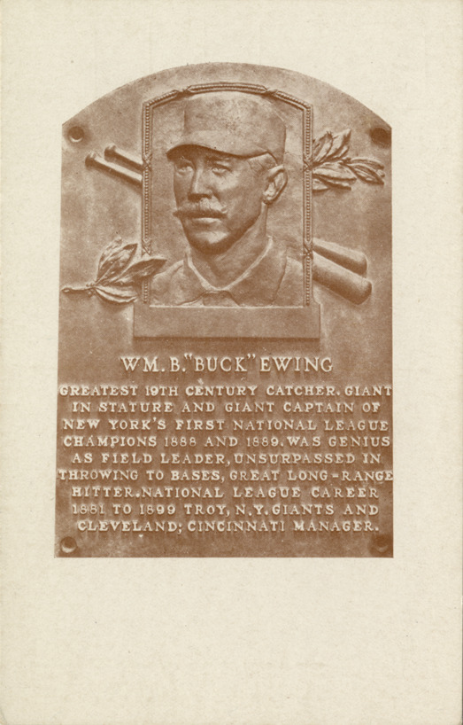 View of bronze relief plaque with portrait of Buck Ewing. Text on plaque reads: "Wm. B. 'Buck' Ewing. Greatest 19th century catcher, giant in stature and giant captain of New York's first National League champions 1888 and 1889. Was genius as field leader, unsurpassed in throwing to bases, great long-range hitter. National League career 1881 to 1899 Troy, N.Y. Giants and Cleveland; Cincinnati manager." Printed on back: "Base ball was invented in Cooperstown, New York, by Abner Doubleday and first played in this village in 1839. The National Base Ball Museum and Hall of Fame and Doubleday Field are maintained here as a shrine to the national game. Pub. by National Base Ball Museum."