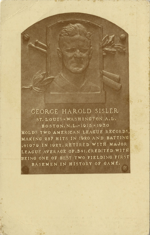 View of bronze relief plaque with portrait of George Sisler. Text on plaque reads: "George Harold Sisler. St. Louis, Washington A.L. Boston, N.L. 1915-1930. Holds two American League records, making 257 hits in 1920 and batting .41979 in 1922. Retired with major league average of .341. Credited with being one of best two fielding first basemen in history of game." Printed on back: "Base ball was invented in Cooperstown, New York, by Abner Doubleday and first played in this village in 1839. The National Base Ball Museum and Hall of Fame and Doubleday Field are maintained here as a shrine to the national game. Pub. by National Base Ball Museum."