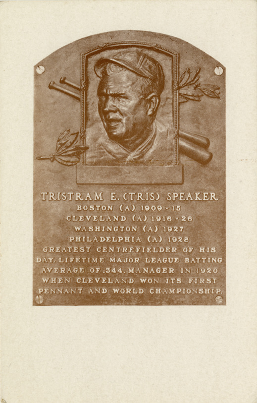 View of bronze relief plaque with portrait of Tris Speaker. Text on plaque reads: "Tristam E. (Tris) Speaker. Boston (A) 1909-15. Cleveland (A) 1916-26. Washington (A) 1927. Philadelphia (A) 1928. Greatest centrefielder of his day. Lifetime major league batting average of .344. Manager in 1920 when Cleveland won its first pennant and world championship." Printed on back: "Base ball was invented in Cooperstown, New York, by Abner Doubleday and first played in this village in 1839. The National Base Ball Museum and Hall of Fame and Doubleday Field are maintained here as a shrine to the national game. Pub. by National Base Ball Museum."