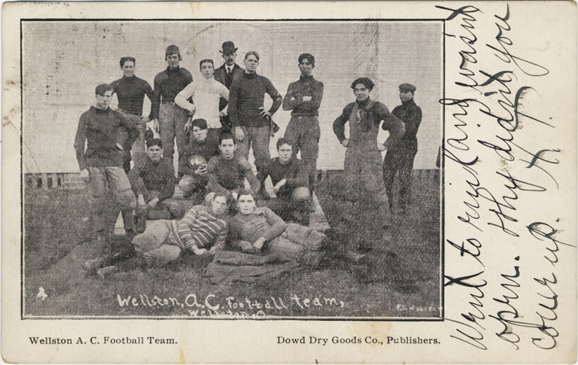 Portrait of Wellston A.C. football team; player in center holds football reading: "06." Printed on image: "Wellston A.C. football team, Wellston, O. F.S. Woodrow." Printed on front: "Wellston A.C. football team. Dowd Dry Goods Co., publishers." Handwritten on front: "Went to ... and wasn't open. Why didn't you cover up. H.T."