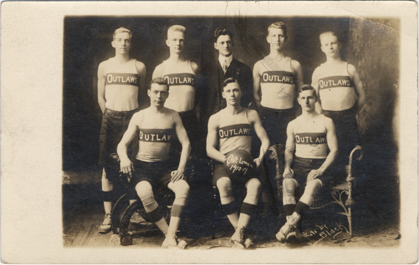 Favorite this☆ Basketball team Description: Group portrait of basketball team and their coach; players wear jerseys with "Outlaws" on front. Player in front row holds basketball reading: "Out Laws 1913-14." Printed on front: "Photo by Black." Details Resource ID: hr000988 Creator: Black Subject: Basketball teams Basketball players Photographic prints Postcards Date Issued: 1913 to 1914 Format: 1 postcard ; 3.5 x 5.5 in. Member of: Ernie Harwell Sports Collection Filing Location: Postcards-Basketball-Teams-Unidentified Rights: Physical rights are retained by DPL. Copyright is retained in accordance with U.S. copyright laws.
