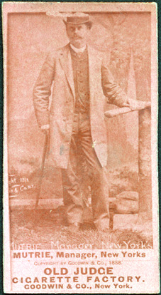 Favorite this☆ Jim Mutrie Description: Portrait of Jim Mutrie, manager of the the New York Giants, holding a cane. Old Judge (N172) series. Printed on front: "Mutrie, manager, New Yorks. Copyright Goodwin & Co., 1888. Old Judge cigarette factory. Goodwin & Co., New York." Details Resource ID: hr001005 Subject: Mutrie, Jim (James J.), 1851-1938 Baseball managers--New York (State)--New York New York Giants (Baseball team) Baseball cards Cigarette cards Albumen prints Publisher: Goodwin & Co. Date Issued: 1887 to 1890 Format: 1 cigarette card ; 2.75 x 1.5 in. Member of: Ernie Harwell Sports Collection Filing Location: Cigarette cards-Goodwin & Co.-Old Judge (N172)-1887-1890-Mutrie, Jim Rights: Physical rights are retained by DPL. Copyright is retained in accordance with U.S. copyright laws.
