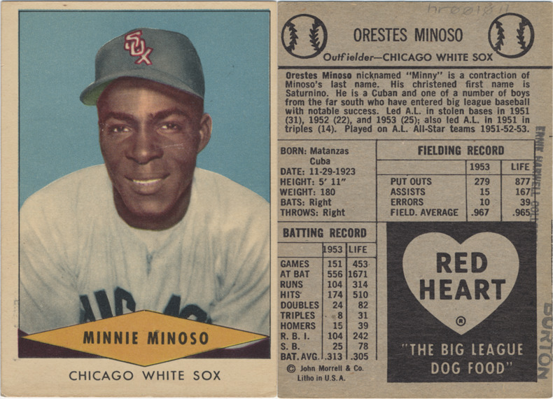 Portrait of Minnie Minoso, outfielder for the Chicago White Sox. Red Heart Dog Food (F156) series. Printed on front: "Minnie Minoso, Chicago White Sox." Printed on back: "Orestes Minoso, outfielder, Chicago White Sox. Orestes Minoso nicknamed 'Minny' is a contraction of Minoso's last name. His christened first name is Saturnino. He is a Cuban and one of a big number of boys from the far south who have entered big league baseball with notable success. Led A.L. in stolen bases in 1951 (31), 1952 (22), and 1953 (25); also led A.L. in 1951 in triples (14). Played on A.L. All-Star teams in 1951-52-53. Born: Matanzas, Cuba. Date: 11-29-1923. Height: 5' 11". Weight: 180. Bats: right. Throws: right. Fielding record. 1953, life. Put outs 279, 877. Assists 15, 167. Errors 10, 39. Field. average .967, .965. Batting record. 1953, life. Games 151, 453. At bat 556, 1671. Runs 104, 314. Hits 174, 510. Doubles 24, 82. Triples 8, 31. Homers 15, 39. R.B.I. 104, 242. S.B. 25, 78. Bat. avg. .313, .305. Red Heart, the big league dog food. [Copyright] John Morrell & Co. Litho in U.S.A."