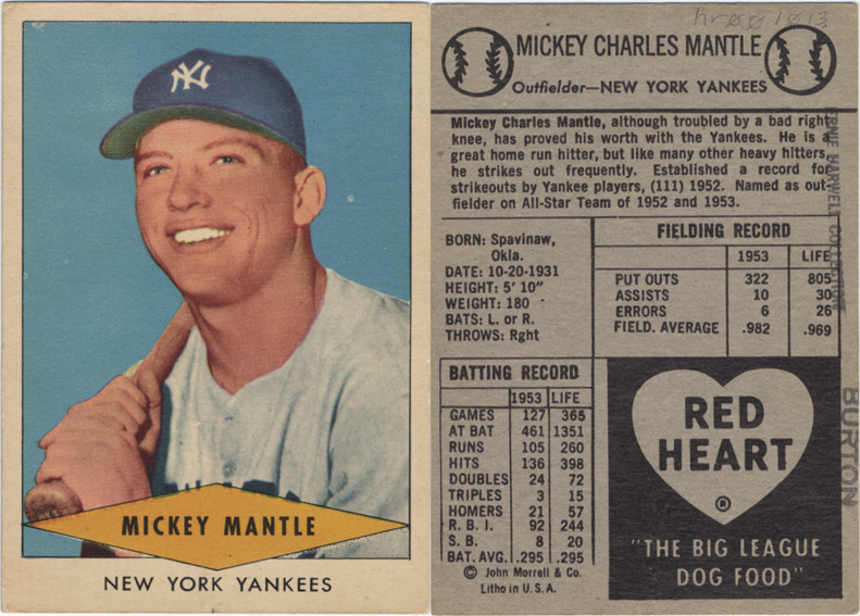 Portrait of Mickey Mantle, outfielder for the New York Yankees. Red Heart Dog Food (F156) series. Printed on front: "Mickey Mantle, New York Yankees." Printed on back: "Mickey Charles Mantle, outfielder, New York Yankees. Mickey Charles Mantle, although troubled by a bad right knee, has proved his worth with the Yankees. He is a great home run hitter, but like many other heavy hitters, he strikes out frequently. Established a record for strikeouts by Yankee players, (111) 1952. Named as outfielder on All-Star team of 1952 and 1953. Born: Spavinaw, Okla. Date: 10-20-1931. Height: 5' 10". Weight: 180. Bats: L. or R. Throws: Rght. Fielding record. 1953, life. Put outs 322, 805. Assists 10, 30. Errors 6, 26. Field average .982, .969. Batting record. 1953, life. Games 127, 365. At bat 461, 1351. Runs 105, 260. Hits 136, 398. Doubles 24, 72. Triples 3, 15. Homers 21, 57. R.B.I. 92, 244. S.B. 8, 20. Bat. avg. .295, .295. Red Heart, the big league dog food. [Copyright] John Morrell & Co. Litho in U.S.A."