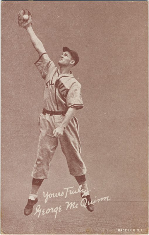 Favorite this☆ George McQuinn Description: Portrait of George McQuinn, baseball player for the St. Louis Browns, catching a fly ball. Salutation Exhibits (W462) series. Printed on front: "Yours truly, George McQuinn. Made in U.S.A." Details Resource ID: hr001034 Subject: McQuinn, George (George Hartley), 1910-1978 Baseball players--Missouri--Saint Louis St. Louis Browns (Baseball team) Baseball cards Publisher: Exhibit Supply Company Date Issued: 1939 to 1946 Format: 1 baseball card ; 5.5 x 3.5 in. Member of: Ernie Harwell Sports Collection Filing Location: Baseball cards-Exhibit Supply Company-Salutation Exhibits (W462)-1939-1946-McQuinn, George Rights: Physical rights are retained by DPL. Copyright is retained in accordance with U.S. copyright laws.