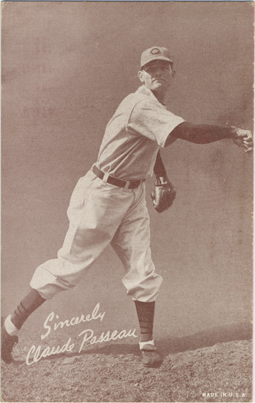 Portrait of Claude Passeau, pitcher for the Chicago Cubs. Salutation Exhibits (W462) series. Printed on front: "Sincerely, Claude Passeau. Made in U.S.A."