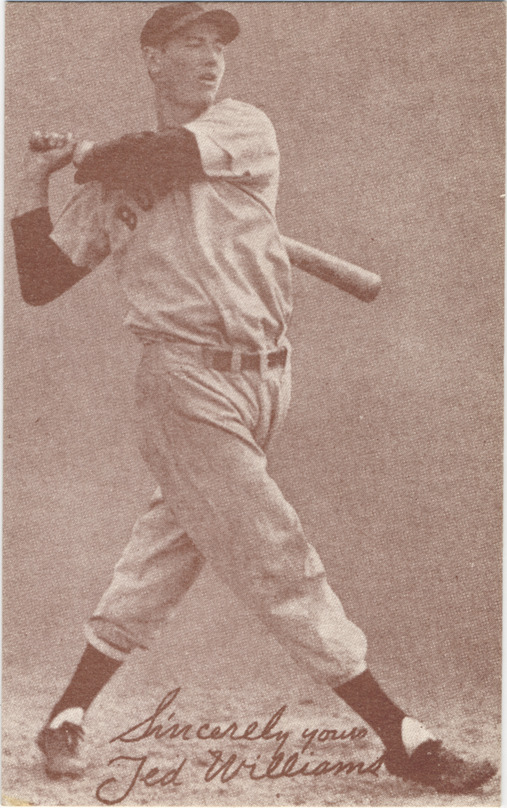 Favorite this☆ Ted Williams Description: Portrait of Ted Williams, baseball player for the Boston Red Sox, holding a baseball bat. Salutation Exhibits (W462) series. Printed on front: "Sincerely yours, Ted Williams. Made in U.S.A." Details Resource ID: hr001047 Subject: Williams, Ted, 1918-2002 Baseball players--Massachusetts--Boston Boston Red Sox (Baseball team) Baseball cards Publisher: Exhibit Supply Company Date Issued: 1939 to 1946 Format: 1 baseball card ; 5.5 x 3.5 in. Member of: Ernie Harwell Sports Collection Filing Location: Baseball cards-Exhibit Supply Company-Salutation Exhibits (W462)-1939-1946-Williams, Ted Rights: Physical rights are retained by DPL. Copyright is retained in accordance with U.S. copyright laws.
