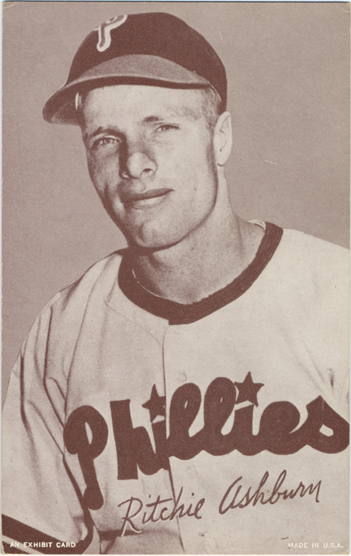 Favorite this☆ Richie Ashburn Description: Portrait of Richie Ashburn, center fielder for the Philadelphia Phillies. Exhibits (W462) series. Printed on front: "Ritchie [sic] Ashburn. An Exhibit card. Made in U.S.A." Details Resource ID: hr001053 Subject: Ashburn, Richie Baseball players--Pennsylvania--Philadelphia Philadelphia Phillies (Baseball team) Baseball cards Publisher: Exhibit Supply Company Date Issued: 1947 to 1966 Format: 1 baseball card ; 5.5 x 3.5 in. Member of: Ernie Harwell Sports Collection Filing Location: Baseball cards-Exhibit Supply Company-Exhibits (W462)-1947-1966-Ashburn, Richie Rights: Physical rights are retained by DPL. Copyright is retained in accordance with U.S. copyright laws.