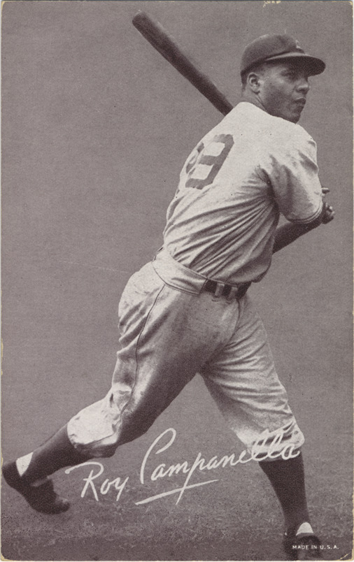 Favorite this☆ Roy Campanella Description: Portrait of Brooklyn Dodgers player Roy Campanella, swinging bat. Exhibits (W462) series. Printed on front: "Roy Campanella. Made in U.S.A." Details Resource ID: hr001065 Subject: Campanella, Roy, 1921-1993 African American baseball players--New York (State)--New York Brooklyn Dodgers (Baseball team) Baseball cards Publisher: Exhibit Supply Company Date Issued: 1947 to 1966 Format: 1 baseball card ; 5.5 x 3.5 in. Member of: Ernie Harwell Sports Collection Filing Location: Baseball cards-Exhibit Supply Company-Exhibits (W462)-1947-1966-Campanella, Roy Rights: Physical rights are retained by DPL. Copyright is retained in accordance with U.S. copyright laws.