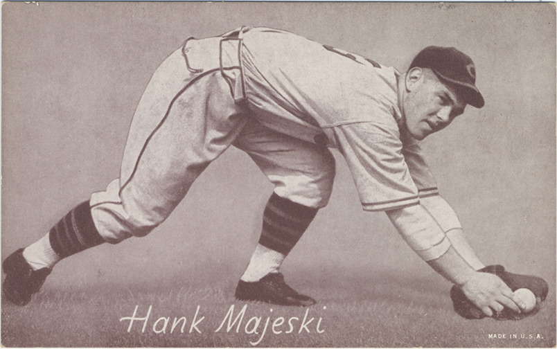 Favorite this☆ Hank Majeski Description: Portrait of Cleveland Indians third baseman Hank Majeski. Exhibits (W462) series. Printed on front: "Hank Majeski. Made in U.S.A." Details Resource ID: hr001127 Subject: Majeski, Hank (Henry), 1916-1991 Baseball players--Ohio--Cleveland Cleveland Indians (Baseball team) Baseball cards Publisher: Exhibit Supply Company Date Issued: 1947 to 1966 Format: 1 baseball card ; 3.5 x 5.5 in. Member of: Ernie Harwell Sports Collection Filing Location: Baseball cards-Exhibit Supply Company-Exhibits (W462)-1947-1966-Majeski, Hank Rights: Physical rights are retained by DPL. Copyright is retained in accordance with U.S. copyright laws.