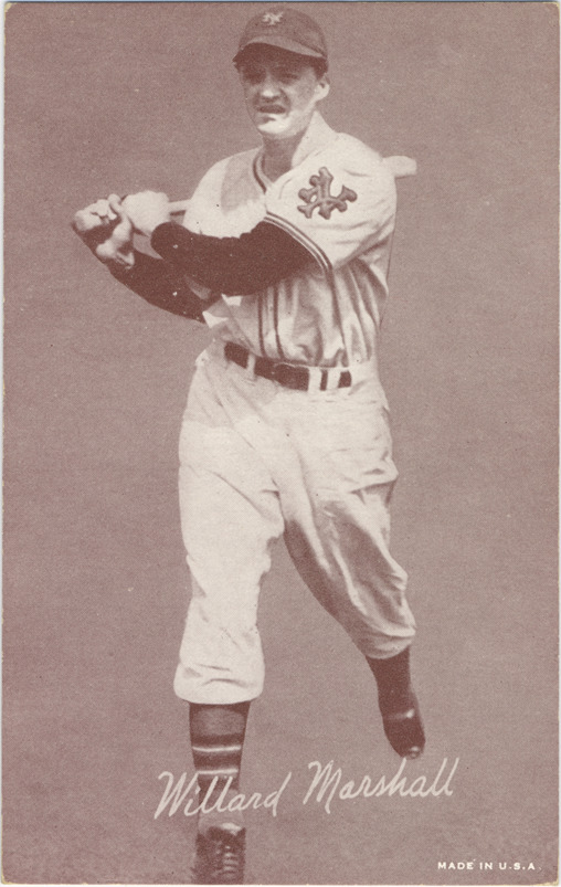 Favorite this☆ Willard Marshall Description: Portrait of New York Giants right fielder Willard Marshall. Exhibits (W462) series. Printed on front: "Willard Marshall. Made in U.S.A." Details Resource ID: hr001128 Subject: Marshall, Willard (Willard Warren), 1921-2000 Baseball players--New York (State)--New York New York Giants (Baseball team) Baseball cards Publisher: Exhibit Supply Company Date Issued: 1947 to 1966 Format: 1 baseball card ; 5.5 x 3.5 in. Member of: Ernie Harwell Sports Collection Filing Location: Baseball cards-Exhibit Supply Company-Exhibits (W462)-1947-1966-Marshall, Willard Rights: Physical rights are retained by DPL. Copyright is retained in accordance with U.S. copyright laws.