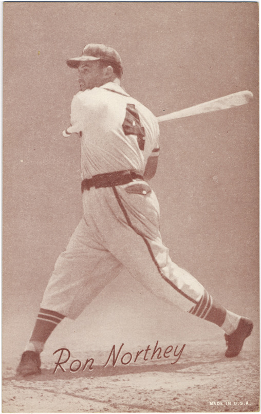 Favorite this☆ Ron Northey Description: Portrait of outfielder Ron Northey swinging a bat. Exhibits (W462) series. Printed on front: "Ron Northey. Made in U.S.A." Details Resource ID: hr001136 Subject: Northey, Ron (Ronald James), 1920-1971 Baseball players Baseball cards Publisher: Exhibit Supply Company Date Issued: 1947 to 1966 Format: 1 baseball card ; 5.5 x 3.5 in. Member of: Ernie Harwell Sports Collection Filing Location: Baseball cards-Exhibit Supply Company-Exhibits (W462)-1947-1966-Northey, Ron Rights: Physical rights are retained by DPL. Copyright is retained in accordance with U.S. copyright laws.