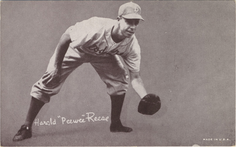 Favorite this☆ Pee Wee Reese Description: Portrait of Brooklyn Dodgers shortstop Pee Wee Reese. Exhibits (W462) series. Printed on front: "Harold 'Peewee' Reese. Made in U.S.A." Details Resource ID: hr001142 Subject: Reese, Pee Wee, 1918-1999 Baseball players--New York (State)--New York Brooklyn Dodgers (Baseball team) Baseball cards Publisher: Exhibit Supply Company Date Issued: 1947 to 1966 Format: 1 baseball card ; 3.5 x 5.5 in. Member of: Ernie Harwell Sports Collection Filing Location: Baseball cards-Exhibit Supply Company-Exhibits (W462)-1947-1966-Reese, Pee Wee Rights: Physical rights are retained by DPL. Copyright is retained in accordance with U.S. copyright laws.