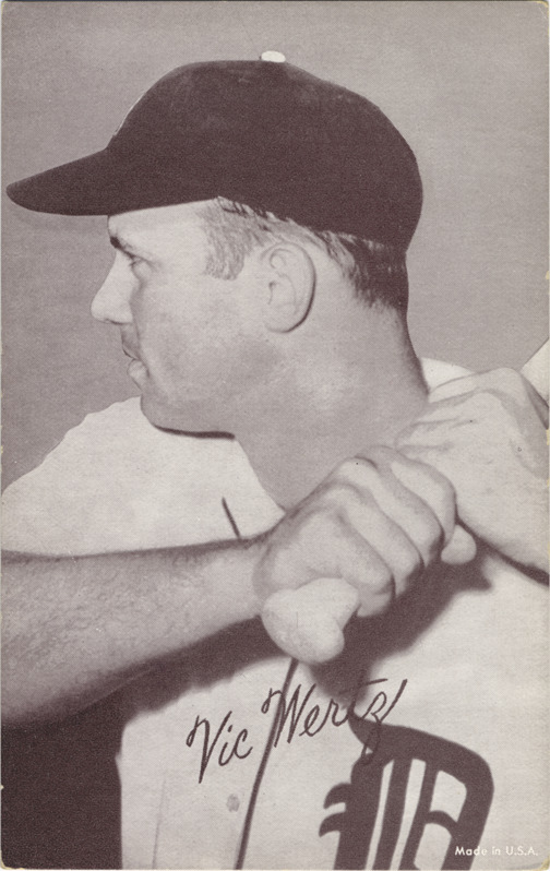 Favorite this☆ Vic Wertz Description: Portrait of Detroit Tigers first baseman and outfielder Vic Wertz at bat. Exhibits (W462) series. Printed on front: "Vic Wertz. Made in U.S.A." Details Resource ID: hr001166 Subject: Wertz, Vic (Victor Woodrow), 1925-1983 Baseball players--Michigan--Detroit Detroit Tigers (Baseball team) Baseball cards Publisher: Exhibit Supply Company Date Issued: 1947 to 1966 Format: 1 baseball card ; 5.5 x 3.5 in. Member of: Ernie Harwell Sports Collection Filing Location: Baseball cards-Exhibit Supply Company-Exhibits (W462)-1947-1966-Wertz, Vic Rights: Physical rights are retained by DPL. Copyright is retained in accordance with U.S. copyright laws.