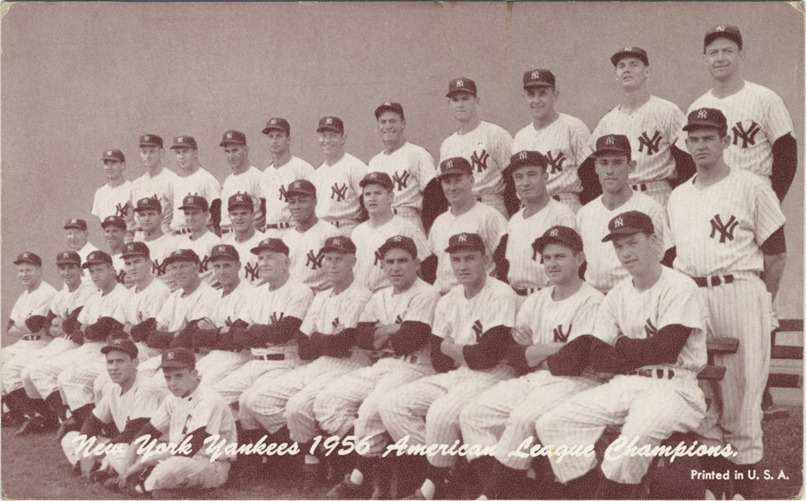 Favorite this☆ New York Yankees in 1956 Description: Group portrait of the New York Yankees. Exhibits (W462) series. Printed on front: "New York Yankees, 1956 American League champions. Printed in U.S.A." Details Resource ID: hr001170 Subject: Baseball teams--Portraits Baseball players--New York (State)--New York New York Yankees (Baseball team) Baseball cards Publisher: Exhibit Supply Company Date Issued: 1947 to 1966 Format: 1 baseball card ; 3.5 x 5.5 in. Member of: Ernie Harwell Sports Collection Filing Location: Baseball cards-Exhibit Supply Company-Exhibits (W462)-1947-1966-Teams-New York Yankees Rights: Physical rights are retained by DPL. Copyright is retained in accordance with U.S. copyright laws.