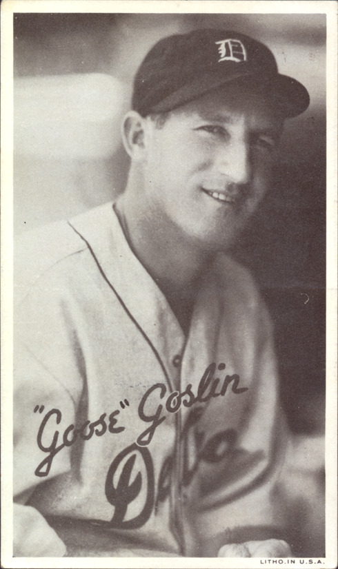 Favorite this☆ Goose Goslin Description: Portrait of Goose Goslin, baseball player for the Detroit Tigers. Wide Pens Premium (R314A) series. Printed on front: "'Goose' Goslin. Litho. in U.S.A." Details Resource ID: hr001189 Subject: Goslin, Goose (Leon Allen), 1900-1971 Baseball players--Michigan--Detroit Detroit Tigers (Baseball team) Baseball cards Publisher: Goudey Gum Co. Date Issued: 1936 Format: 1 baseball card ; 5.5 x 3.25 in. Member of: Ernie Harwell Sports Collection Filing Location: Baseball Cards-Goudey Gum Co.-Wide Pens Premium (R314A)-1936-Goslin, Goose Rights: Physical rights are retained by DPL. Copyright is retained in accordance with U.S. copyright laws.