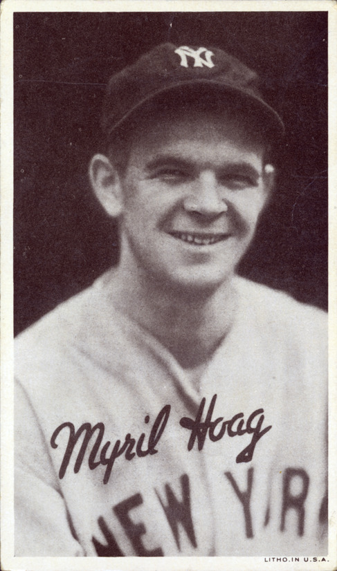 Favorite this☆ Myril Hoag Description: Portrait of Myril Hoag, baseball player for the New York Yankees. Wide Pens Premium (R314A) series. Printed on front: "Myril Hoag. Litho. in U.S.A." Details Resource ID: hr001195 Subject: Hoag, Myril (Myril Oliver), 1908-1971 Baseball players--New York (State)--New York New York Yankees (Baseball team) Baseball cards Publisher: Goudey Gum Co. Date Issued: 1936 Format: 1 baseball card ; 5.5 x 3.25 in. Member of: Ernie Harwell Sports Collection Filing Location: Baseball Cards-Goudey Gum Co.-Wide Pens Premium (R314A)-1936-Hoag, Myril Rights: Physical rights are retained by DPL. Copyright is retained in accordance with U.S. copyright laws.