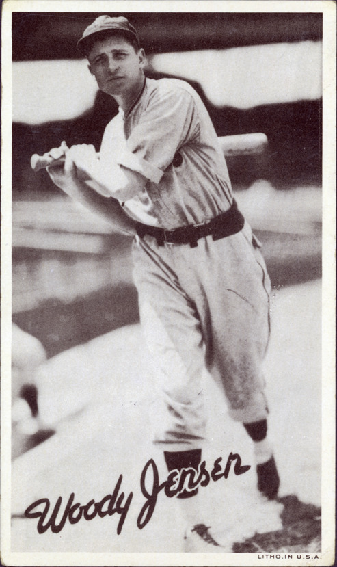 Favorite this☆ Woody Jensen Description: Portrait of Woody Jensen, baseball player for the Pittsburgh Pirates, holding a baseball bat. Wide Pens Premium (R314A) series. Printed on front: "Woody Jensen. Litho. in U.S.A." Details Resource ID: hr001196 Subject: Jensen, Woody (Forrest Docenus), 1907-2001 Baseball players--Pennsylvania--Pittsburgh Pittsburgh Pirates (Baseball team) Baseball cards Publisher: Goudey Gum Co. Date Issued: 1936 Format: 1 baseball card ; 5.5 x 3.25 in. Member of: Ernie Harwell Sports Collection Filing Location: Baseball Cards-Goudey Gum Co.-Wide Pens Premium (R314A)-1936-Jensen, Woody Rights: Physical rights are retained by DPL. Copyright is retained in accordance with U.S. copyright laws.