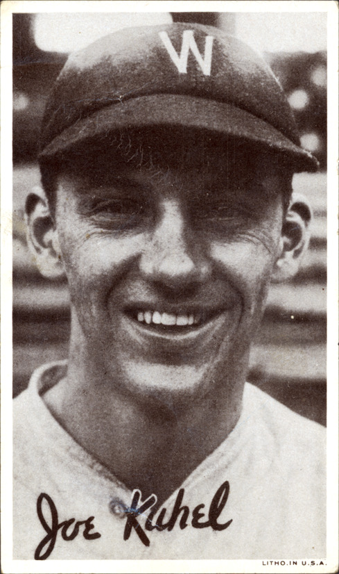 Favorite this☆ Joe Kuhel Description: Portrait of Joe Kuhel, baseball player for the Washington Senators. Wide Pens Premium (R314A) series. Printed on front: "Joe Kuhel. Litho. in U.S.A." Details Resource ID: hr001199 Subject: Kuhel, Joe (Joseph Anthony), 1906-1984 Baseball players--Washington (D.C.) Washington Senators (Baseball team : 1886-1960) Baseball cards Publisher: Goudey Gum Co. Date Issued: 1936 Format: 1 baseball card ; 5.5 x 3.25 in. Member of: Ernie Harwell Sports Collection Filing Location: Baseball Cards-Goudey Gum Co.-Wide Pens Premium (R314A)-1936-Kuhel, Joe Rights: Physical rights are retained by DPL. Copyright is retained in accordance with U.S. copyright laws.