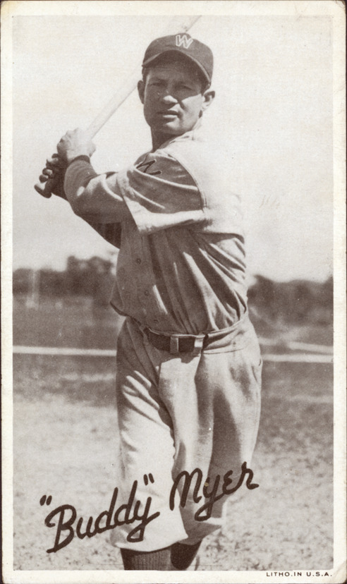 Favorite this☆ Buddy Myer Description: Portrait of Buddy Myer, baseball player for the Washington Senators, holding a baseball bat. Wide Pens Premium (R314A) series. Printed on front: "Buddy Myer. Litho. in U.S.A." Details Resource ID: hr001206 Subject: Myer, Buddy (Charles Solomon), 1904-1974 Baseball players--Washington (D.C.) Washington Senators (Baseball team : 1886-1960) Baseball cards Publisher: Goudey Gum Co. Date Issued: 1936 Format: 1 baseball card ; 5.5 x 3.25 in. Member of: Ernie Harwell Sports Collection Filing Location: Baseball Cards-Goudey Gum Co.-Wide Pens Premium (R314A)-1936-Myer, Buddy Rights: Physical rights are retained by DPL. Copyright is retained in accordance with U.S. copyright laws.