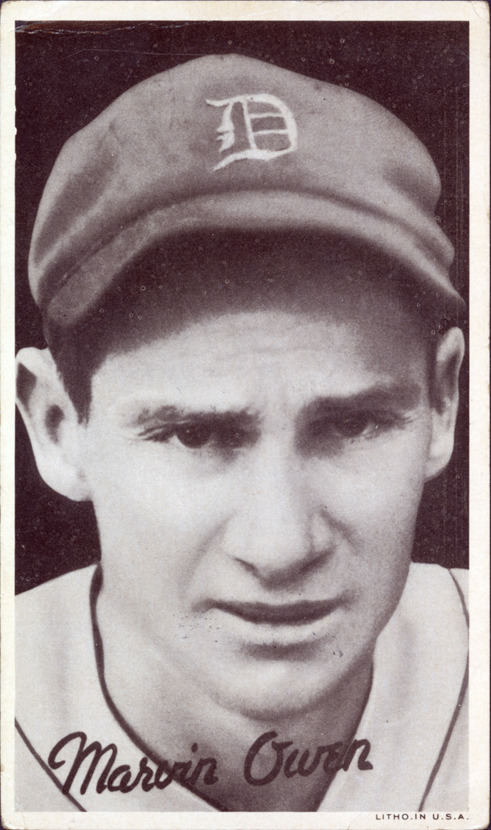 Favorite this☆ Marv Owen Description: Portrait of Marv Owen, baseball player for the Detroit Tigers. Wide Pens Premium (R314A) series. Printed on front: "Marvin Owen. Litho. in U.S.A." Details Resource ID: hr001209 Subject: Owen, Marv, 1906-1991 Baseball players--Michigan--Detroit Detroit Tigers (Baseball team) Baseball cards Publisher: Goudey Gum Co. Date Issued: 1936 Format: 1 baseball card ; 5.5 x 3.25 in. Member of: Ernie Harwell Sports Collection Filing Location: Baseball Cards-Goudey Gum Co.-Wide Pens Premium (R314A)-1936-Owen, Marv Rights: Physical rights are retained by DPL. Copyright is retained in accordance with U.S. copyright laws.