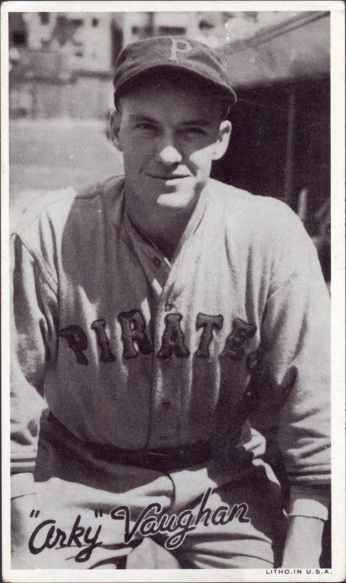 Favorite this☆ Arky Vaughn Description: Portrait of Arky Vaughn, baseball player for the Pittsburgh Pirates. Wide Pens Premium (R314A) series. Printed on front: "Arky Vaughn. Litho. in U.S.A." Details Resource ID: hr001217 Subject: Vaughn, Arky (Joseph Floyd), 1912-1952 Baseball players--Pennsylvania--Pittsburgh Pittsburgh Pirates (Baseball team) Baseball cards Publisher: Goudey Gum Co. Date Issued: 1936 Format: 1 baseball card ; 5.5 x 3.25 in. Member of: Ernie Harwell Sports Collection Filing Location: Baseball Cards-Goudey Gum Co.-Wide Pens Premium (R314A)-1936-Vaughn, Arky Rights: Physical rights are retained by DPL. Copyright is retained in accordance with U.S. copyright laws.