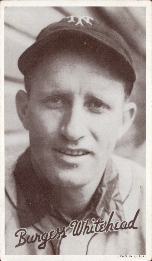 Favorite this☆ Burgess Whitehead Description: Portrait of Burgess Whitehead, baseball player for the New York Giants. Wide Pens Premium (R314A) series. Printed on front: "Burgess Whitehead. Litho. in U.S.A." Details Resource ID: hr001222 Subject: Whitehead, Burgess (Burgess Urquhart), 1910-1993 Baseball players--New York (State)--New York New York Giants (Baseball team) Baseball cards Publisher: Goudey Gum Co. Date Issued: 1936 Format: 1 baseball card ; 5.5 x 3.25 in. Member of: Ernie Harwell Sports Collection Filing Location: Baseball Cards-Goudey Gum Co.-Wide Pens Premium (R314A)-1936-Whitehead, Burgess Rights: Physical rights are retained by DPL. Copyright is retained in accordance with U.S. copyright laws.