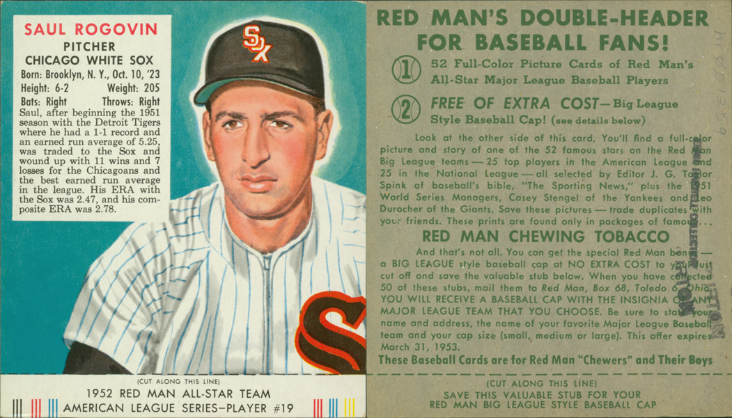 Portrait of Saul Rogovin, pitcher for the Chicago White Sox. (T232) series. Printed on front: "Saul Rogovin, pitcher, Chicago White Sox. Born: Brooklyn, N.Y., Oct. 10, '23. Height: 6-2. Weight: 205. Bats: right. Throws: right. Saul, after beginning the 1951 season with the Detroit Tigers where he had a 1-1 record and an earned run average of 5.25, was traded up to the Sox and wound up with 11 wins and 7 losses for the Chicagoans and the best earned run average in the league. His ERA with the Sox was 2.47, and his composite ERA was 2.78. 1952 Red Man All-Star team American League series, player #19." Printed on back: "Red Man's double-header for baseball fans! 1. 52 full-color picture cards of Red Man's all-star major league baseball players. 2. Free of extra cost, big league style baseball cap! (see details below). Look at the other side of this card. You'll find a full-color picture and story of one of the 52 famous stars on the Red Man big league teams -- 25 top players in the American League and 25 in the National League -- all selected by editor J.G. Taylor Spink of baseball's bible, "The Sporting News," plus the 1951 World Series managers, Casey Stengel of the Yankees and Leo Durocher of the Giants. Save these pictures -- trade these duplicates with your friends. These prints are found only in packages of famous Red Man chewing tobacco. And that's not all. You can get the special Red Man bonus -- a big league style baseball cap at no extra cost to you! Just cut off and save the valuable stub below. When you have collected 50 of these stubs, mail them to Red Man, Box 68, Toledo 6, Ohio. You will receive a baseball cap with the insignia of any major league team that you choose. Be sure to state your name and address, the name of your favorite major league baseball team and your cap size (small, medium and large). This offer expires March 31, 1953. These baseball cards are for Red Man 'chewers' and their boys. Save this valuable stub for your Red Man big league style baseball cap."