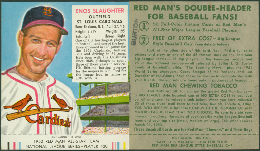 Portrait of Enos Slaughter, outfielder for the St. Louis Cardinals. (T232) series. Printed on front: "Enos Slaughter, outfield, St. Louis Cardinals. Born: Roxboro, N.C., April 27, '16. Height: 5-8 1/2. Weight: 195. Bats: left. Throws: right. One of the hustlingest players in baseball, and one of the best, Enos appeared in 123 games for the 1951 Cardinals, batting .281 and driving in 64 runs. He's been with the Cardinals since 1938, although he spent three of those years in service. His lifetime batting average for the majors is .306. Tied for the league lead in triples in 1949 with 13. 1952 Red Man All-Star team American League series, player #20." Printed on back: "Red Man's double-header for baseball fans! 1. 52 full-color picture cards of Red Man's all-star major league baseball players. 2. Free of extra cost, big league style baseball cap! (see details below). Look at the other side of this card. You'll find a full-color picture and story of one of the 52 famous stars on the Red Man big league teams -- 25 top players in the American League and 25 in the National League -- all selected by editor J.G. Taylor Spink of baseball's bible, "The Sporting News," plus the 1951 World Series managers, Casey Stengel of the Yankees and Leo Durocher of the Giants. Save these pictures -- trade these duplicates with your friends. These prints are found only in packages of famous Red Man chewing tobacco. And that's not all. You can get the special Red Man bonus -- a big league style baseball cap at no extra cost to you! Just cut off and save the valuable stub below. When you have collected 50 of these stubs, mail them to Red Man, Box 68, Toledo 6, Ohio. You will receive a baseball cap with the insignia of any major league team that you choose. Be sure to state your name and address, the name of your favorite major league baseball team and your cap size (small, medium and large). This offer expires March 31, 1953. These baseball cards are for Red Man 'chewers' and their boys. Save this valuable stub for your Red Man big league style baseball cap."