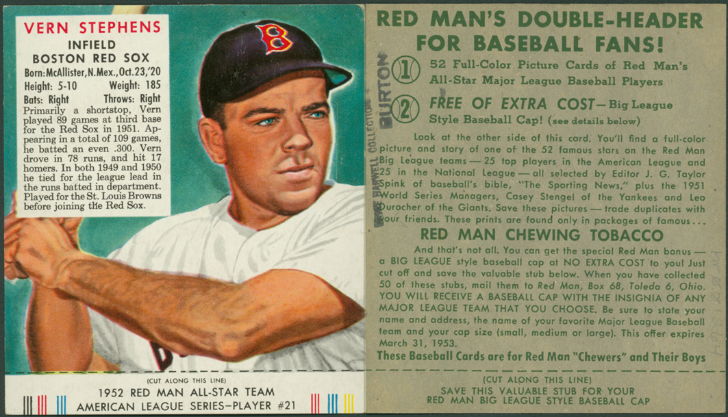 Portrait of Vern Stephens, infielder for the Boston Red Sox. (T232) series. Printed on front: "Vern Stephens, infield, Boston Red Sox. Born: McAllister, N. Mex., Oct. 23, '20. Height: 5-10. Weight: 185. Bats: right. Throws: right. Primarily a shortstop, Vern played 89 games at third base for the Red Sox in 1951. Appearing in a total of 109 games, he batted an even .300. Vern drove in 78 runs, and hit 17 homers. In both 1949 and 1950 he tied for the league lead in the runs batted in department. Played for the St. Louis Browns before joining the Red Sox. 1952 Red Man All-Star team American League series, player #21." Printed on back: "Red Man's double-header for baseball fans! 1. 52 full-color picture cards of Red Man's all-star major league baseball players. 2. Free of extra cost, big league style baseball cap! (see details below). Look at the other side of this card. You'll find a full-color picture and story of one of the 52 famous stars on the Red Man big league teams -- 25 top players in the American League and 25 in the National League -- all selected by editor J.G. Taylor Spink of baseball's bible, "The Sporting News," plus the 1951 World Series managers, Casey Stengel of the Yankees and Leo Durocher of the Giants. Save these pictures -- trade these duplicates with your friends. These prints are found only in packages of famous Red Man chewing tobacco. And that's not all. You can get the special Red Man bonus -- a big league style baseball cap at no extra cost to you! Just cut off and save the valuable stub below. When you have collected 50 of these stubs, mail them to Red Man, Box 68, Toledo 6, Ohio. You will receive a baseball cap with the insignia of any major league team that you choose. Be sure to state your name and address, the name of your favorite major league baseball team and your cap size (small, medium and large). This offer expires March 31, 1953. These baseball cards are for Red Man 'chewers' and their boys. Save this valuable stub for your Red Man big league style baseball cap."