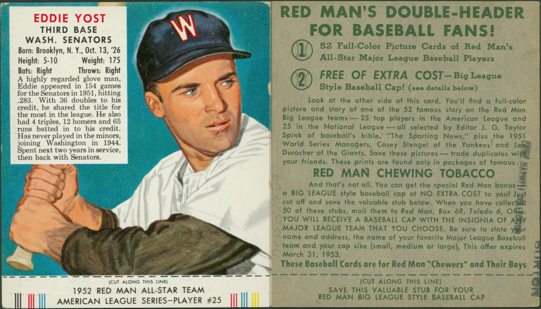 Portrait of Eddie Yost, third baseman for the Washington Senators. (T232) series. Printed on front: "Eddie Yost, third base, Wash. Senators. Born: Brooklyn, N.Y., Oct. 13, '26. Height: 5-10. Weight: 175. Bats: right. Throws: right. A highly regarded glove man, Eddie appeared in 154 games for the Senators in 1951, hitting .283. With 36 doubles to his credit, he shared the title for the most in the league. He also had 4 triples, 12 homers and 65 runs batted in to his credit. Has never played in the minors, joining Washington in 1944. Spent next two years in service, then back with Senators. 1952 Red Man All-Star team American League series, player #25." Printed on back: "Red Man's double-header for baseball fans! 1. 52 full-color picture cards of Red Man's all-star major league baseball players. 2. Free of extra cost, big league style baseball cap! (see details below). Look at the other side of this card. You'll find a full-color picture and story of one of the 52 famous stars on the Red Man big league teams -- 25 top players in the American League and 25 in the National League -- all selected by editor J.G. Taylor Spink of baseball's bible, "The Sporting News," plus the 1951 World Series managers, Casey Stengel of the Yankees and Leo Durocher of the Giants. Save these pictures -- trade these duplicates with your friends. These prints are found only in packages of famous Red Man chewing tobacco. And that's not all. You can get the special Red Man bonus -- a big league style baseball cap at no extra cost to you! Just cut off and save the valuable stub below. When you have collected 50 of these stubs, mail them to Red Man, Box 68, Toledo 6, Ohio. You will receive a baseball cap with the insignia of any major league team that you choose. Be sure to state your name and address, the name of your favorite major league baseball team and your cap size (small, medium and large). This offer expires March 31, 1953. These baseball cards are for Red Man 'chewers' and their boys. Save this valuable stub for your Red Man big league style baseball cap."