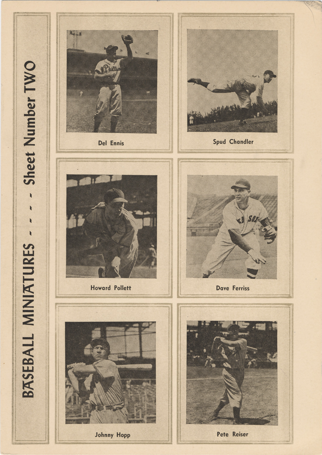 Individual portraits of baseball players Del Ennis, Spud Chandler, Howie Pollet, Dave Ferriss, Johnny Hopp and Pete Reiser. Printed on front: "Baseball miniatures, sheet number two. Del Ennis, Spud Chandler, Howard Pollett [sic], Dave Ferriss, Johnny Hopp, Pete Reiser."