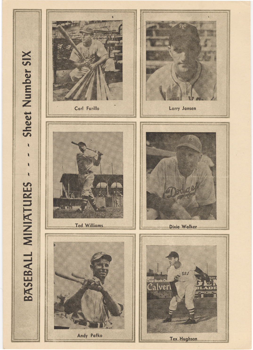 Individual portraits of baseball players Carl Furillo, Larry Jansen, Ted Williams, Dixie Walker, Andy Pafko and Tex Hughson. Printed on front: "Baseball miniatures, sheet number six. Carl Furillo, Larry Jansen, Ted Williams, Dixie Walker, Andy Pafko, Tex Hughson."