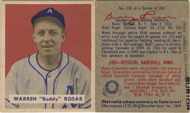 Portrait of Buddy Rosar, catcher for the Philadelphia Athletics. Bowman series. Printed on front: "Warren 'Buddy' Rosar." Printed on back: "No. 138 of a series of 240. Buddy Rosar, catcher, Philadelphia Athletics. Born: Buffalo, N.Y., July 3, 1915. Bats: right. Throws: right. Ht.: 5:10. Wt. 170. Went through entire 1946 season without an error. Last year he caught 90 games, hit .255 and continued his superior fielding, leading AL backstops with a .997 average. had 5 years in minors, joining Yankees in 1939. In 1942, he went to Cleveland and in 1945 was traded to A's. One of top catchers in baseball. #202, official baseball ring. Made of durable metal. Adjustable, fits any size finger. Silverplate oxidized finish shows detail of official baseball emblem. Baseball of white plastic. Sides show baseball and crossed bats design. Send only 15 [cents] and 3 baseball wrappers to: Baseball, P.O. Box 491, New York 46, N.Y. (Not valid where contrary to state laws). Offer expires 12/31/49. [Copyright] Bowman Gum, Inc., 1949."