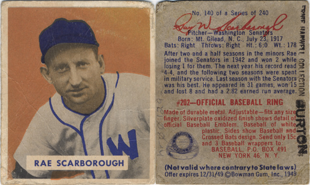 Portrait of Ray Scarborough, pitcher for the Washington Senators. Bowman series. Printed on front: "Rae Scarborough." Printed on back: "No. 140 of a series of 240. Ray W. Scarborough, pitcher, Washington Senators. Born: Mt. Gilead, N.C., July 23, 1917. Bats: right. Throws: right. Ht.: 6:0. Wt.: 178. After two and a half seasons in the minors Rae joined the Senators in 1942 and won 2 while losing 1 for them. The next year his record read 4-4, and the following two seasons were spent in military service. Last season with the Senators was his best. He appeared in 31 games, won 15 and lost 8 and had a 2.82 earned run average. #202, official baseball ring. Made of durable metal. Adjustable, fits any size finger. Silverplate oxidized finish shows detail of official baseball emblem. Baseball of white plastic. Sides show baseball and crossed bats design. Send only 15 [cents] and 3 baseball wrappers to: Baseball, P.O. Box 491, New York 46, N.Y. (Not valid where contrary to state laws). Offer expires 12/31/49. [Copyright] Bowman Gum, Inc., 1949."