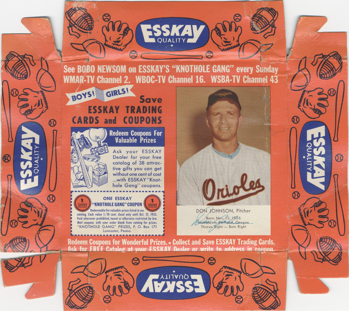 Portrait of Don Johnson, pitcher for the Baltimore Orioles. Printed on bottom of box: "Don Johnson, pitcher. Born: Nov. 12, 1926. Hometown: Portland, Oregon. Throws right. Bats right. See Bobo Newsom on Esskay's 'Knothole Gang' every Sunday WMAR-TV channel 2. WBOC-TV channel 16. WSBA-TV channel 43. Boys! Girls! Save Esskay trading cards and coupons. Redeem coupons for valuable prizes. Ask your Esskay dealer for your free catalog of 38 attractive gifts you can get without one cent of cost with Esskay 'Knothole Gang' coupons. 1 coupon. One Esskay 'Knothole Gang' coupon. Redeemable for valuable prizes listed in our catalog. Cash value 1/10 cent. Good only until Oct. 31, 1955. Void wherever prohibited, taxed or otherwise restricted by law. Mail coupons with your order blank from catalog for prizes. 'Knothole Gang' prizes, P.O. Box 171, Lancaster, Penna. Reedem coupons for wonderful prizes. Collect and save Esskay trading cards. Ask for free catalog at your Esskay dealer or write to address in coupon." Printed on box sides are drawings of baseball equipment and text: "Esskay quality."