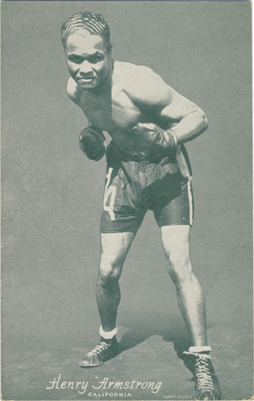 Favorite this☆ Henry Armstrong Description: Portrait of boxer Henry Armstrong. Exhibits series. Printed on front: "Henry Armstrong. California. Made in U.S.A." Details Resource ID: hr001302 Subject: Armstrong, Henry, 1912-1988 African American boxers--California Sports cards Publisher: Exhibit Supply Company Date Issued: 1947 to 1966 Format: 1 sports card ; 5.5 x 3.5 in. Member of: Ernie Harwell Sports Collection Filing Location: Boxing cards-Exhibit Supply Company-Exhibits-1947-1966-Armstrong, Henry Rights: Physical rights are retained by DPL. Copyright is retained in accordance with U.S. copyright laws.
