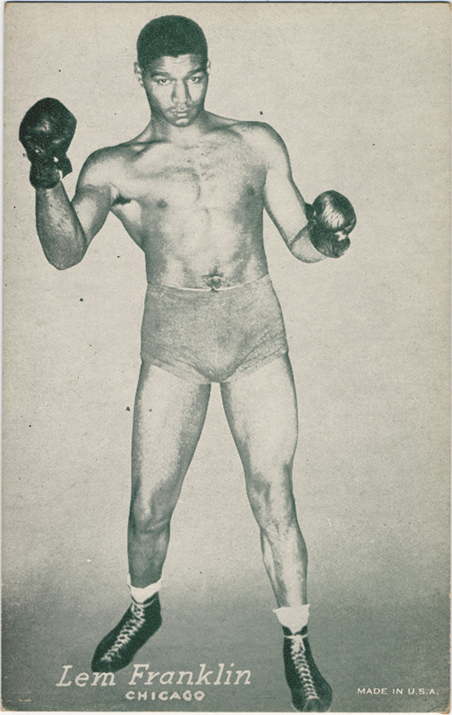 Favorite this☆ Lem Franklin Description: Portrait of boxer Lem Franklin. Exhibits series. Printed on front: "Lem Franklin. Chicago. Made in U.S.A." Details Resource ID: hr001310 Subject: Franklin, Lem, 1916-1944 African American boxers--Illinois--Chicago Sports cards Publisher: Exhibit Supply Company Date Issued: 1947 to 1966 Format: 1 sports card ; 5.5 x 3.5 in. Member of: Ernie Harwell Sports Collection Filing Location: Boxing cards-Exhibit Supply Company-Exhibits-1947-1966-Franklin, Lem Rights: Physical rights are retained by DPL. Copyright is retained in accordance with U.S. copyright laws.