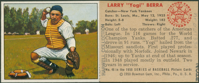Portrait of Yogi Berra, catcher for the New York Yankees. Bowman series. Printed on back: "Larry 'Yogi' Berra. Catcher, New York Yankees. Born: St. Louis, Mo., May 12, 1925. Height: 5-8. Weight: 183. Bats: left. Throws: right. One of the top catchers of the American League. In 116 games for the world champion Yanks. Batted .277, and drove in 91 runs. 'Yogi' hailed from the Missouri sandlots. First played professionally with Norfolk. Joined Newark in 1946; up to Yanks at end of that season. In 1948 played mostly in outfield. Two years in service. No. 46 in the 1950 series of baseball picture cards. [Copyright] 1950 Bowman Gum, Inc., Phila., Pa., U.S.A. Picture Card Collectors Club, 5-star Bowman series."