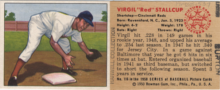 Portrait of Virgil Stallcup, shortstop for the Cincinnati Reds. Bowman series. Printed on back: "Virgil Stallcup. Shortstop, Cincinnati Reds. Born: Ravensford, N.C., Jan. 3, 1923. Height: 6-2. Weight: 178. Bats: right. Throws: right. Virgil hit .228 in 149 games in his rookie year, 1948, and upped his average to .254 last season. In 1947 he hit .340 for Jersey City. In a game against Baltimore that year he got 6 hits in six times at bat. Entered organized baseball in 1941 as third baseman, but switched to short the following season. Spent 3 years in service. No. 116 in the 1950 series of baseball picture cards. [Copyright] 1950 Bowman Gum, Inc., Phila., Pa., U.S.A. Picture Card Collectors Club, 5-star Bowman series."
