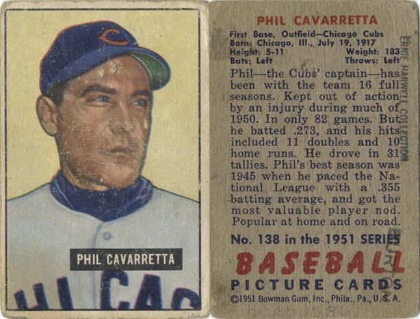 Portrait of Phil Cavarretta, first baseman and outfielder for the Chicago Cubs. Bowman series. Printed on front: "Phil Cavarretta." Printed on back: "Phil Cavarretta. First base, outfield, Chicago Cubs. Born: Chicago, Ill., July 19, 1917. Height: 5-11. Weight: 183. Bats: left. Throws: left. Phil--the Cubs' captain--has been with the team 16 full seasons. Kept out of action by an injury during much of 1950. In only 82 games. But he batted .273, and his hits included 11 doubles and 10 home runs. He drove in 31 tallies. Phil's best season was 1945 when he paced the National League with a .355 batting average, and got the most valuable player nod. Popular at home and on road. No. 138 in the 1951 series baseball picture cards. [Copyright] 1951 Bowman Gum, Inc., Phila., Pa., U.S.A."
