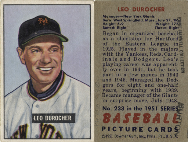 Portrait of Leo Durocher, manager for the New York Giants. Bowman series. Printed on front: "Leo Durocher." Printed on back: "Leo Durocher. Manager, New York Giants. Born: West Springfield, Mass., July 27, '06. Height: 5-9. Weight: 175. Batted: right. Threw: right. Began in organized baseball as a shortstop for Hartford of the Eastern League in 1925. Played in the majors with Yankees, Reds, Cardinals and Dodgers. Leo's playing career was apparently over in 1941, but he took part in a few games in 1943 and 1945. Managed the Dodgers for eight and one-half years, beginning with 1939. Became manager of the Giants in surprise move, July 1948. No. 233 in the 1951 series baseball picture cards. [Copyright] 1951 Bowman Gum, Inc., Phila., Pa., U.S.A."