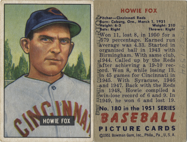 Portrait of Howie Fox, pitcher for the Cincinnati Reds. Bowman series. Printed on front: "Howie Fox." Printed on back: "Howie Fox. Pitcher, Cincinnati Reds. Born: Coburg, Ore., March 1, 1921. Height: 6-3. Weight: 210. Won 11, lost 8, in 1950 for a .579 percentage. Earned run average was 4.33. Started in organized ball in 1943 with Birmingham. With same club, 1944. Called up by the Reds after achieving a 19-10 record. Won 8, while losing 13, in 45 games for Cincinnati, in 1945. With Syracuse, 1946 and 1947. Back with Reds in 1948, Howie compiles a win-lose record of 6 and 9. In 1949, he won 6 and lost 19. No. 180 in the 1951 series baseball picture cards. [Copyright] 1951 Bowman Gum, Inc., Phila., Pa., U.S.A."