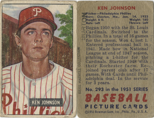 Portrait of Ken Johnson, pitcher for the Philadelphia Phillies. Bowman series. Printed on front: "Ken Johnson." Printed on back: "Ken Johnson. Pitcher, Philadelphia Phillies. Born: Clayton, Mo., Jan. 14, 1923. Height: 6 ft. Weight: 180. Bats: left. Throws: left. Began 1950 with the St. Louis Cardinals. Switched to the Phillies. In a total of 16 games for the season. Won 4, lost 1. Entered professional ball in 1941. Made bow in National League at end of the 1947 season, pitching a 1-hitter for the Cardinals. Started 1948 with their Rochester farm. Rejoined parent club after 17 games. With Cards until Philadelphia deal. In the service for 3 years. No. 293 in the 1951 series baseball picture cards. [Copyright] 1951 Bowman Gum, Inc., Phila., Pa., U.S.A."