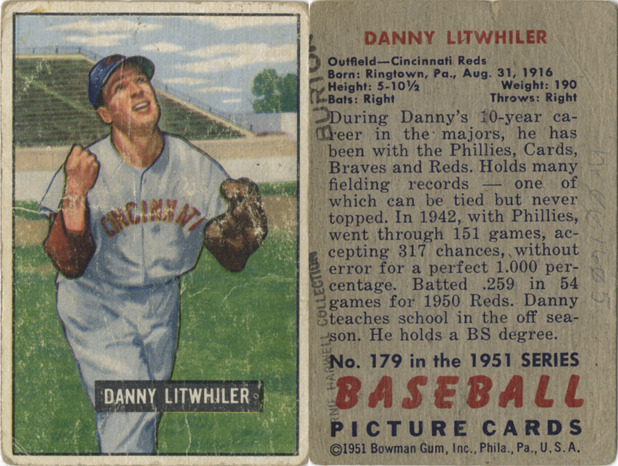 Portrait of Danny Litwhiler, outfielder for the Cincinnati Reds. Bowman series. Printed on front: "Danny Litwhiler." Printed on back: "Danny Litwhiler. Outfield, Cincinnati Reds. Born: Ringtown, Pa., Aug. 31, 1916. Height: 5-10 1/2. Weight: 190. Bats: right. Throws: right. During Danny's 10-year career in the majors, he has been with the Phillies, Cards, Braves and Reds. Holds many fielding records, of which can be tied but never topped. In 1942, with Phillies, went throught 151 games, accepting 317 chances, without error for a perfect 1.000 percentage. Batted .259 in 54 games for 1950 Reds. Danny teaches school in the off season. He holds a BS degress. No. 179 in the 1951 series baseball picture cards. [Copyright] 1951 Bowman Gum, Inc., Phila., Pa., U.S.A."