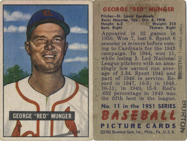 Portrait of Red Munger, pitcher for the St. Louis Cardinals. Bowman series. Printed on front: "George 'Red' Munger." Printed on back: "George 'Red' Munger. Pitcher, St. Louis Cardinals. Born: Houston, Tex., Oct. 4, 1918. Height: 6-2. Weight: 210. Bats: right. Throws: right. Appeared in 32 game in 1950. Won 7, lost 8. Spent 6 seasons in minors before coming to Cardinals for the 1943 campaign. In 1944, won 11, while losing 3. Led National League pitchers with an amazingly low earned run average of 1.34. Spent 1945 and part of 1946 in service. Record in 1947, 16-5; in 1948, 10-11; in 1949, 15-8. Red's .652 percentage in 1949 was the fifth best in the league. No. 11 in the 1951 series baseball picture cards. [Copyright] 1951 Bowman Gum, Inc., Phila., Pa., U.S.A."