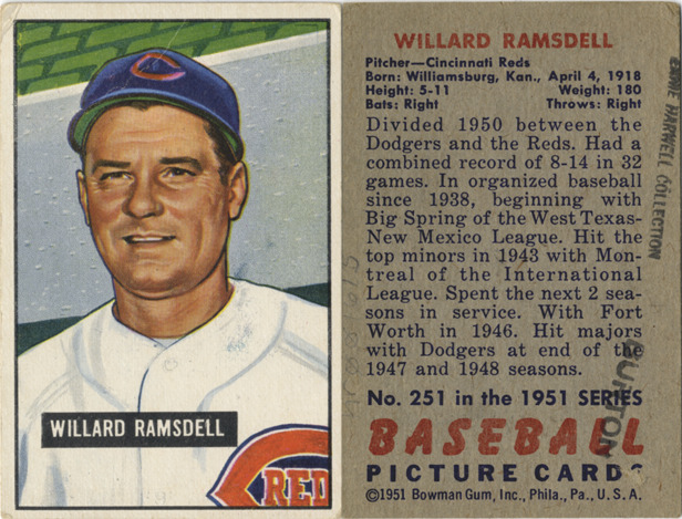 Portrait of Willie Ramsdell, pitcher for the Cincinnati Reds. Bowman series. Printed on front: "Willard Ramsdell." Printed on back: "Willard Ramsdell. Pitcher, Cincinnati Reds. Born: Williamsburg, Kan., April 4, 1918. Height: 5-11. Weight: 180. Bats: right. Throws: right. Divided 1950 between the Dodgers and the Reds. Had a combined record of 8-14 in 32 games. In organized baseball since 1938, beginning with Big Spring of the West Texas-New Mexico League. Hit the top minors in 1943 with Montreal of the International League. Spent the next 2 seasons in service. With Fort Worth in 1946. Hit majors with Dodgers at end of the 1947 and 1948 seasons. No. 251 in the 1951 series baseball picture cards. [Copyright] 1951 Bowman Gum, Inc., Phila., Pa., U.S.A."